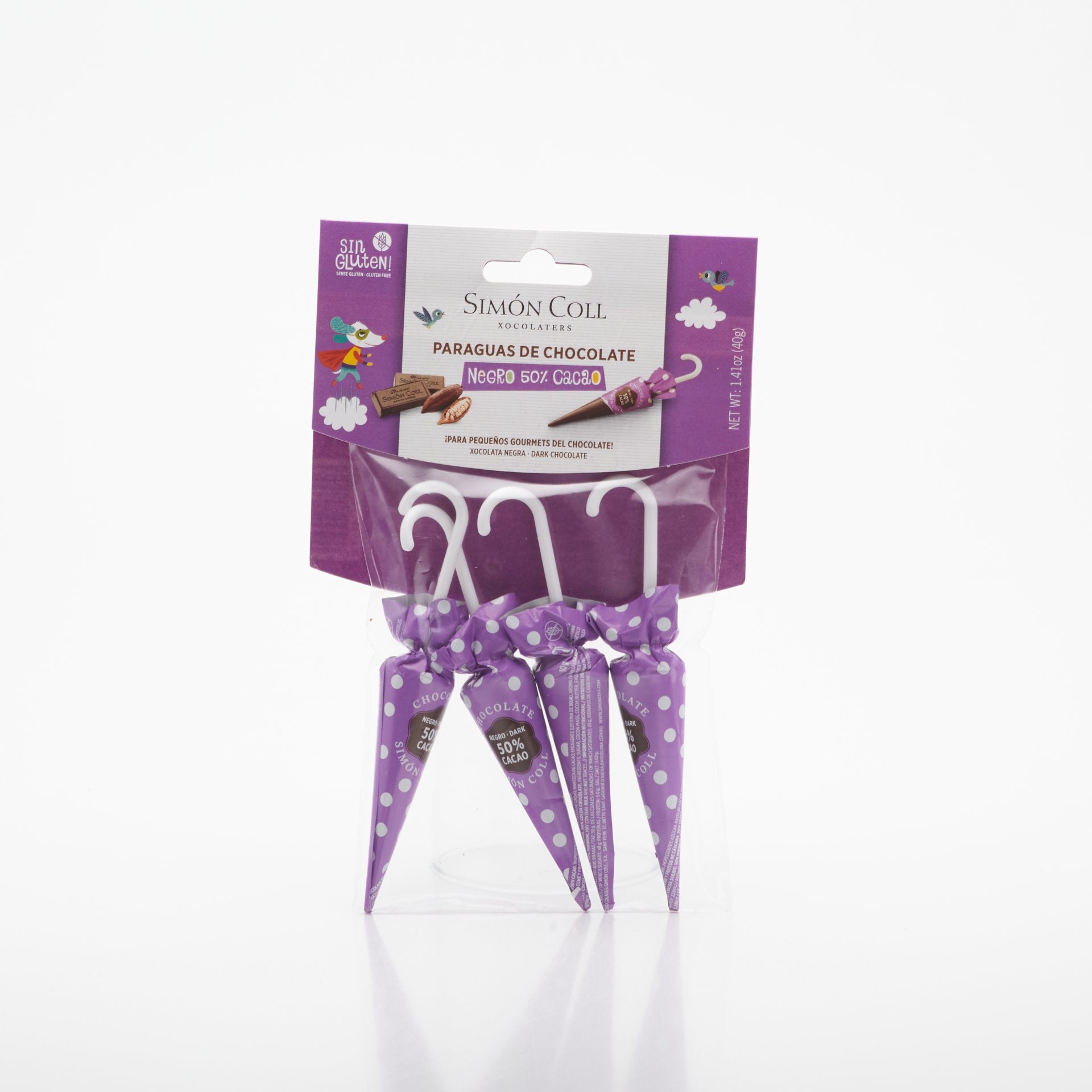 Balíček 4 dáždnikov vyrobených z 50% čokolády podľa tradičnéj receptúry Simon Coll. Bez mlieka a lepku. Ideálny pre zdrave mlsanie pre deti.