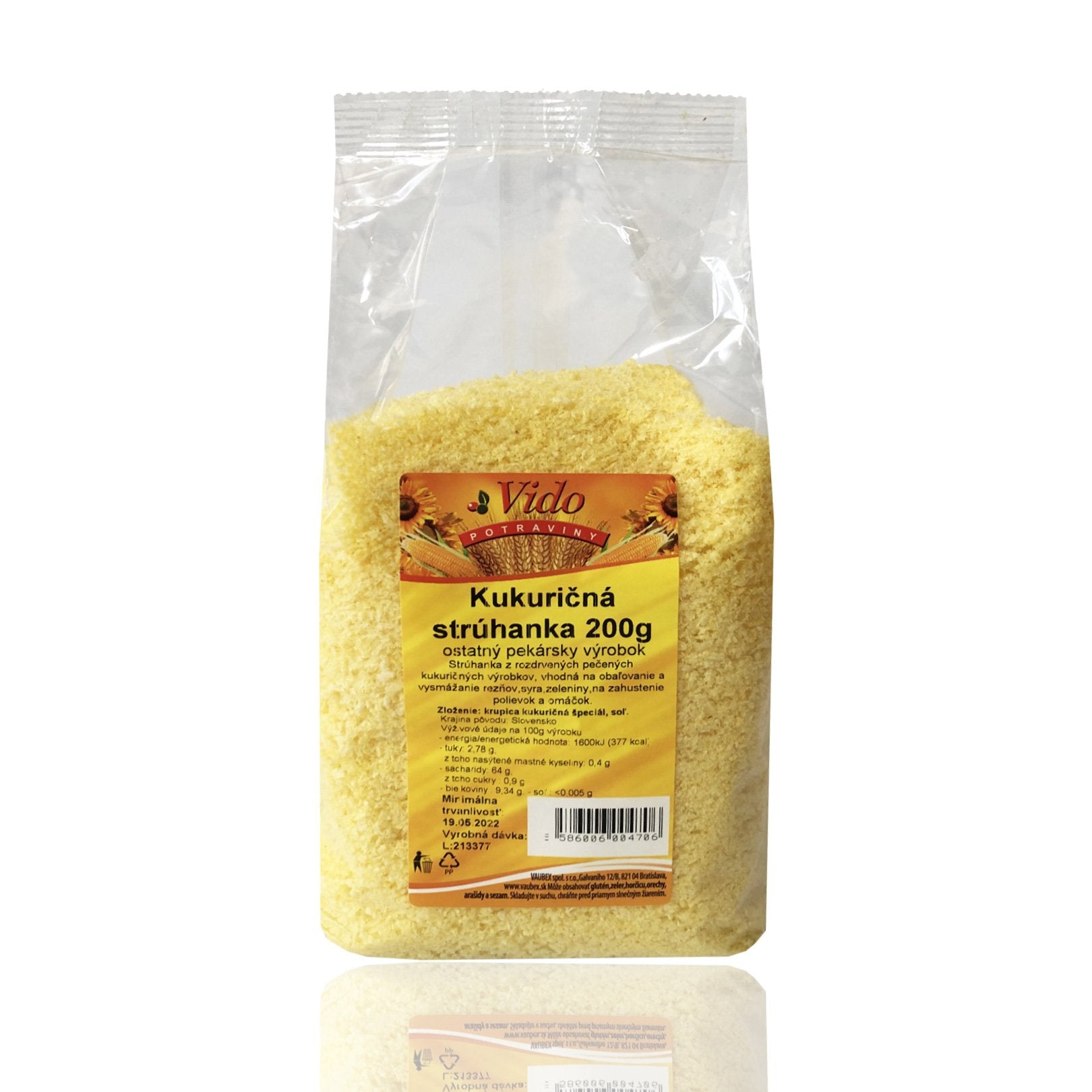 Kukuričná strúhanka 200g VIDO je bezgluténový výrobok. NonGMO. Je vhodná pre alergikov, celiatikov, pre zdravú výživu. Má jedinečnú chuť, je chrumkavá, nenasakuje tuk, zostáva krásne zlatistá. Je bohatá na vitamíny, minerály, bielkoviny aj vlákninu. Prispieva k správnemu fungovaniu metabolizmu. Je bohatým zdrojom vitamínu C, E a zinku, fosforu a horčíka. Používa sa ako vrchná vrstva pri obaľovaní pokrmov, v trojobale Kukuričná múka VIDO, vajíčko, Kukuričná strúhanka VIDO, ale aj na zahusťovanie omáčok i prípravu bezlepkových jedál, zemiakových knedlí a zemiakových ciest.
